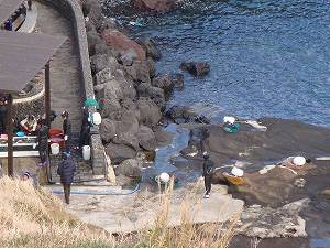 | 海女の潜水漁公演は毎日2回(PM1:30と3:00)行われる |