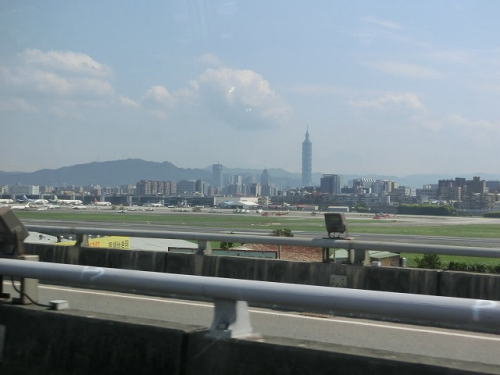 桃園空港から台北市内へ 高速道路で向う 遠くに台北101が見える |